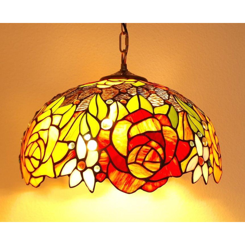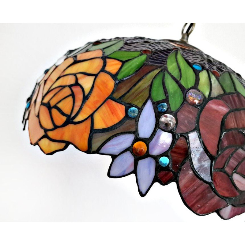 Echtes Tiffany Glas. Der Schirmdurchmesser dieser hübschen Tiffany-Deckenleuchte beträgt ca. 40 cm. Der Schirm ist 23 cm hoch. Beleuchtet wird diese schöne Tiffanylampe durch: zwei Glühlampen mit E27-Gewinde bis max. je. 60 W. Wir empfehlen LED 1-9 W. warmes Licht nach Wahl.