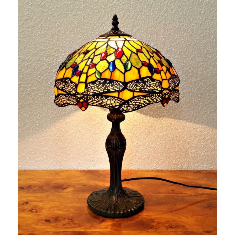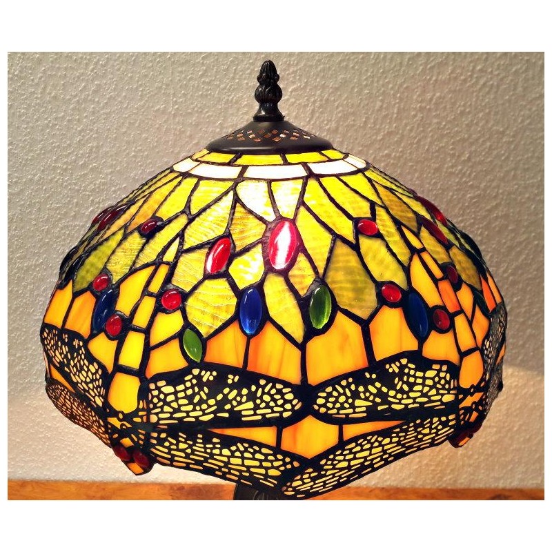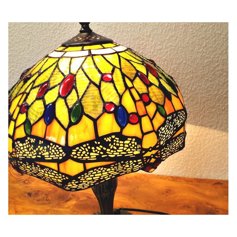Der Lampenfuß besteht aus einer Metalllegierung. Die Beleuchtung dieser Tiffanyleuchte erfolgt durch eine Glühlampe E27 mit max. 60 W. Wir empfehlen Beleuchtung LED 1- 9 W.
