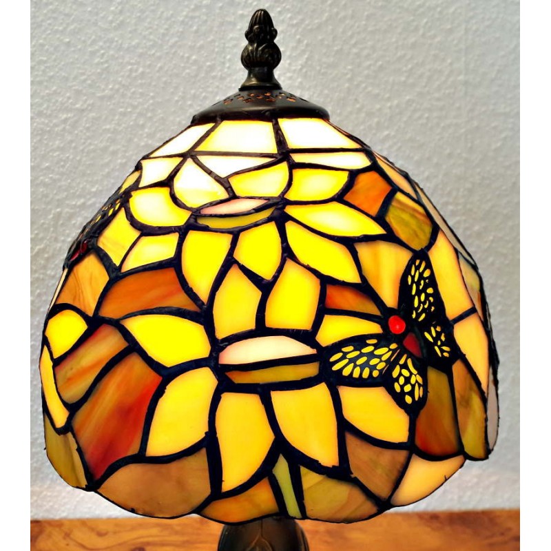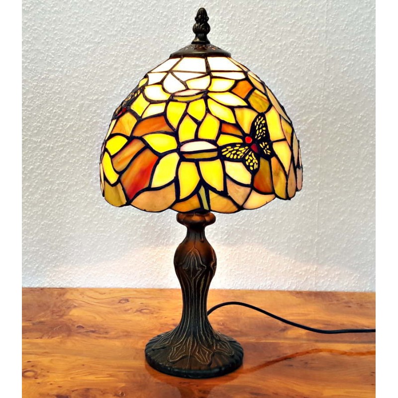Die Beleuchtung dieser Tiffanyleuchte erfolgt durch eine Glühlampe E14 mit max. 40 W. / LED 6 W. warmes Licht nach Wahl.
