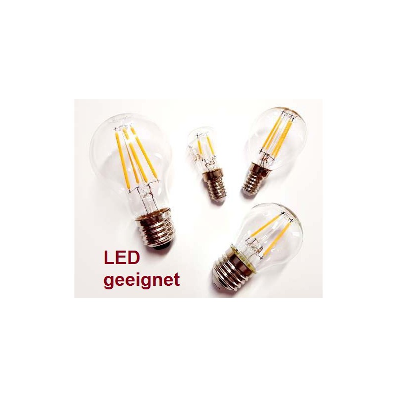 Unsere Lampen sind für alle Arten von Leuchtmitteln geeignet. Glühlampen, Sparlampen und LED-Lampen haben unterschiedliche Stromverbrauchswerte. Wir empfehlen die Verwendung von energiesparenden LED-Lampen mit warmem Lichtton.