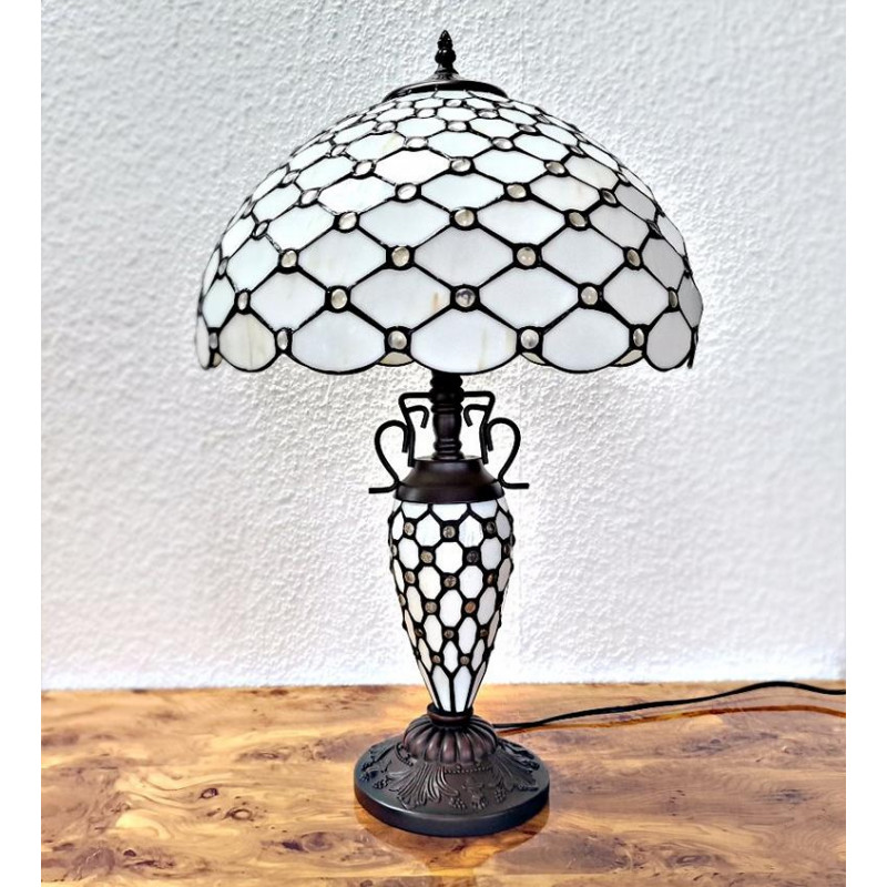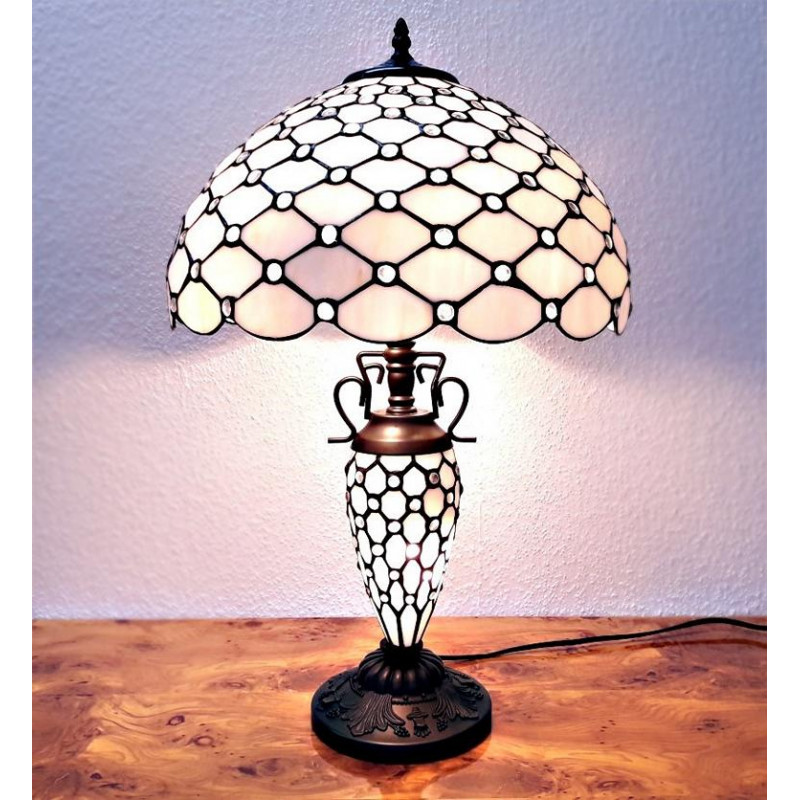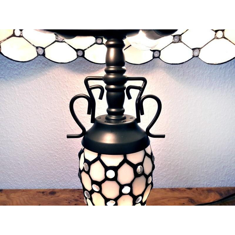 Tiffany-Lampe mit verziertem Fuß. Echtes Tiffany Glas. Diese Tiffanylampe ist ca. 62 cm hoch, der Durchmesser des Schirms beträgt ca. 40 cm. Der ansprechend gestaltete Lampenfuß besteht aus einer Metalllegierung. Die Beleuchtung erfolgt durch: zwei Glühlampen E27 je max. 60 W. / LED 1-9 W. und E14 mit max. 40 W./ LED 1-6 W. warmes Licht nach Wahl.